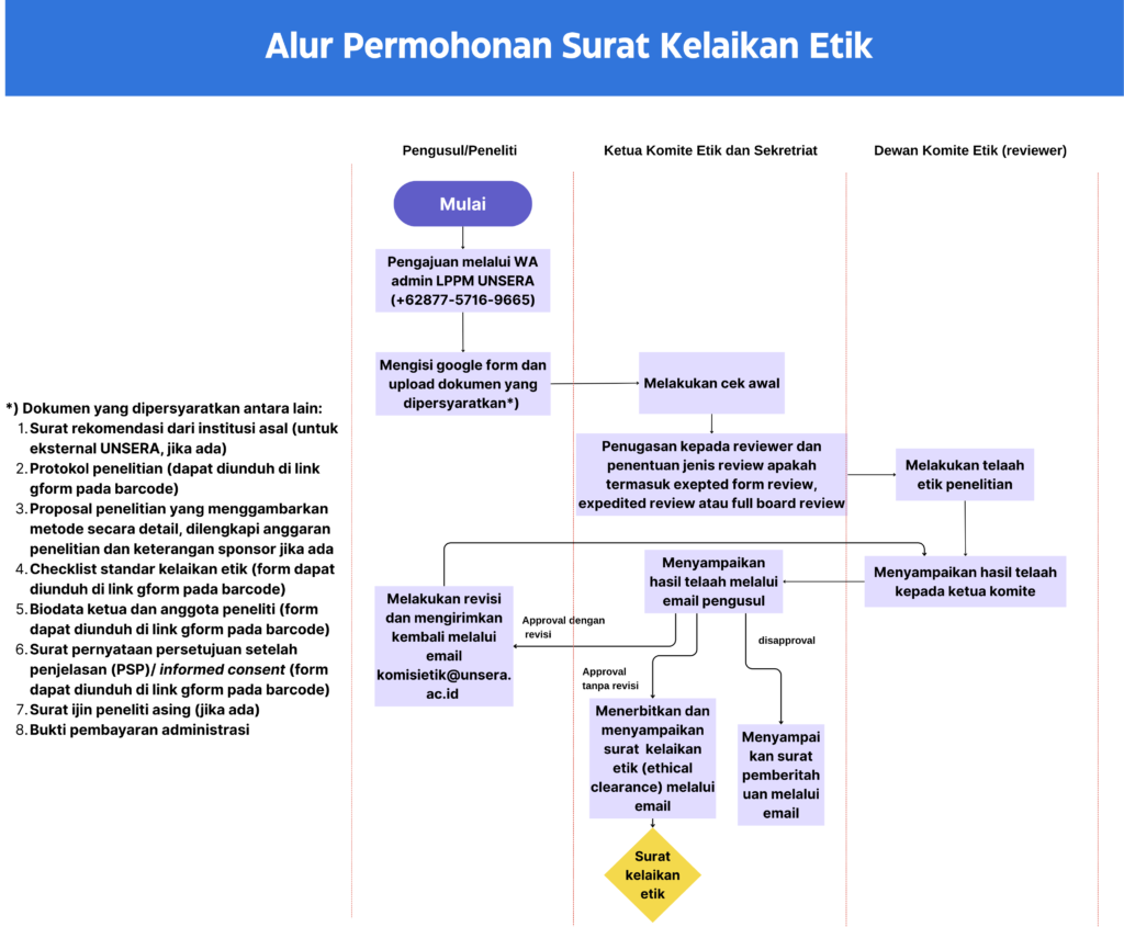 Komite Etik Penelitian Universitas Serang Raya membuka pendaftaran pengajuan Surat Kelaikan Etik Penelitian (Ethical Clearance) bagi seluruh peneliti baik internal maupun eksternal Universitas Serang Raya, sesuai SK Rektor Nomor 092/UNSERA/SK/VIII/2025. Adapun alur pendaftaran tertera pada gambar sebagai berikut: